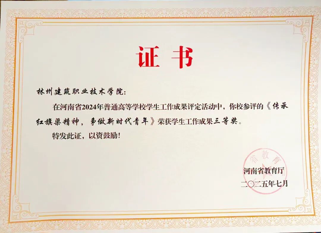 近日,河南省教育厅公布了2024年普通高等学校学生工作优秀成果获奖名单。我校申报的学生工作成果《传承红旗渠精神,争做新时代青年》荣获三等奖,充分展现了我校在构建红色文化育人体系、落实“三全育人”方面取得的扎实成效。