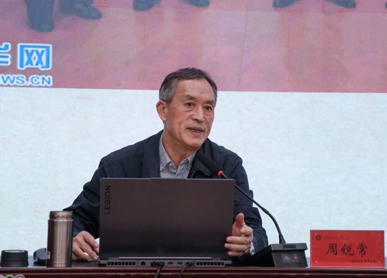 周教授在红旗渠管理与精神文化研究领域深耕不辍、笃行致远,创作了《人工天河红旗渠》《红旗渠墨迹集珍》等颇具影响力的著作,牵头开展红旗渠纪念馆的规划设计与陈列布展工作,同时积极参与红旗渠申报世界文化遗产相关工作,是红旗渠精神研究与传播工作中的关键学者。 在主题演讲环节,周锐常教授围绕“中国梦视域下的红旗渠精神及其当代价值”展开了全面深入的解读。他系统回顾了红旗渠从作为“绝壁求生”的水利工程到成为“精神丰碑”的伟大蜕变历程,生动讲述了以杨贵同志为代表的林县共产党人,秉持“自力更生、艰苦创业、团结协作、无私奉献”的精神,带领广大群众历经十年之久,在太行绝壁之上成功凿出“人工天河”这一壮丽的奋斗史诗。与此同时,周教授紧密结合新时代背景,精准剖析了红旗渠精神与实现中华民族伟大复兴中国梦之间的内在联系,明确指出红旗渠精神不仅是中国共产党人精神谱系的关键组成部分,更是激励广大青年学子攻坚克难、成长成才的强大精神源泉。周教授的讲解深入浅出、鞭辟入里,既生动还原了历史细节,又深刻阐释了时代价值,使在场师生深受鼓舞与触动。