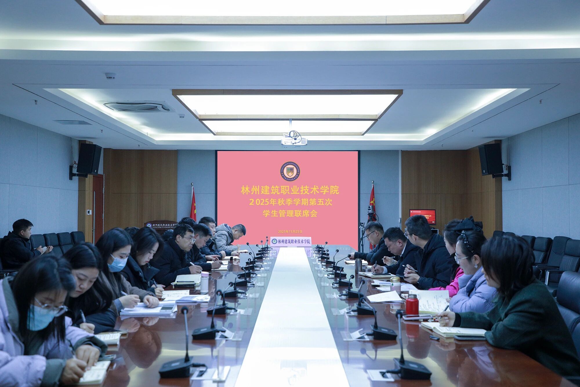 11月25日,林州建筑职业技术学院2025年秋季学期第五次学生管理联席会在行政楼211会议室召开。学校党委副书记、副校长郭鹏出席会议并讲话,党务工作部、学生工作部、总务处及相关服务单位负责人参加会议。