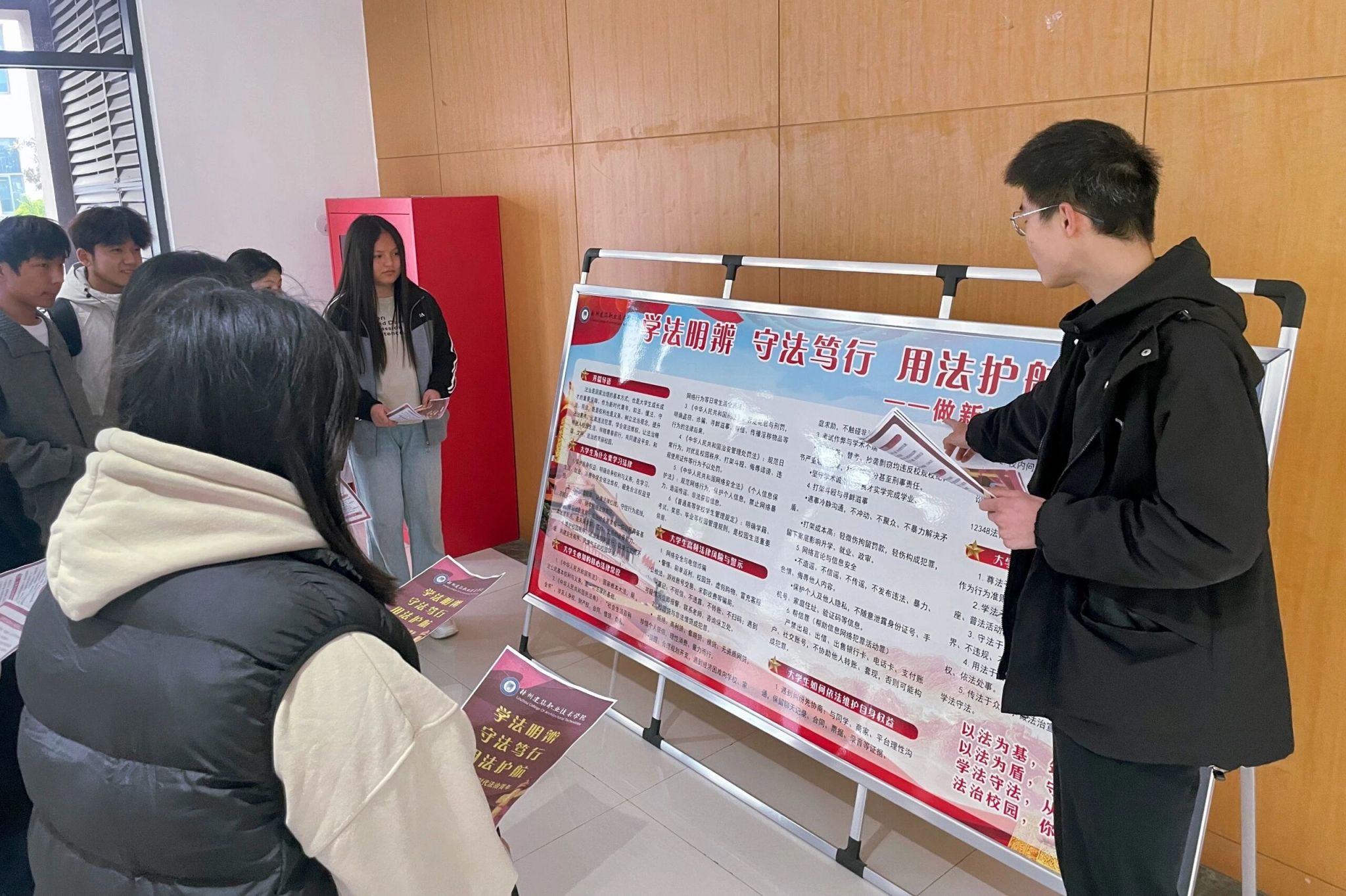 专题教育会后,为进一步深化法治宣传成效,学生工作部在二号教学楼设置法治教育宣传展板,同时向过往学生发放法治教育宣传页,安排工作人员现场引导学生主动学习法治知识,让法治宣传延伸至校园各个角落,推动法治观念潜移默化融入学生日常。