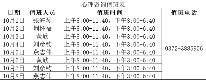 国庆中秋小长假已经来临,为保证心理咨询服务“不断线”,帮助大家在放松身心的同时做好情绪管理,林州建筑职业技术学院学生工作部心理健康中心十一假期持续面向全校同学开展线上心理咨询服务,助力大家度过一个身心愉悦的十一假期。现将有关事项通知如下: