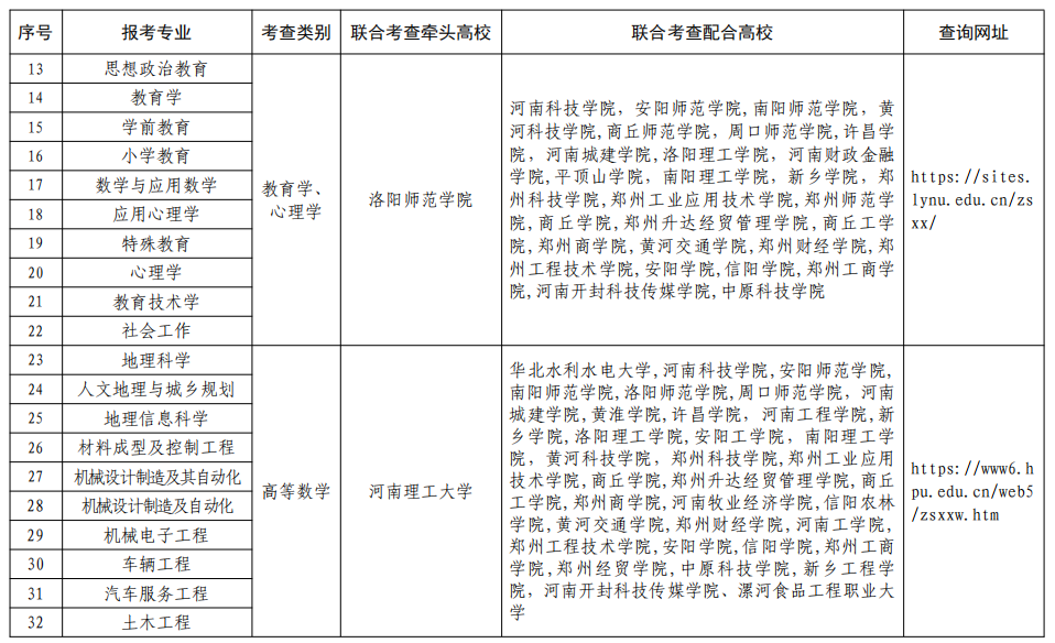 二、合理制定联考方案。各联合考查组要根据本专业大类培养目标和对考生能力的要求,结合报考情况,合理制定联合考查方案,明确高校考查时间、考查地点、考查方式、录取规则、联系电话、网址等事项。各牵头高校要于3月10日前将联合考查方案上传至“河南省普通高校招生章程核定系统”(网址:http://gxzszc.jyt.henan.gov.cn)进行核定,3月15日前向社会公布。考生可登录附表中的相关网址进行查询。