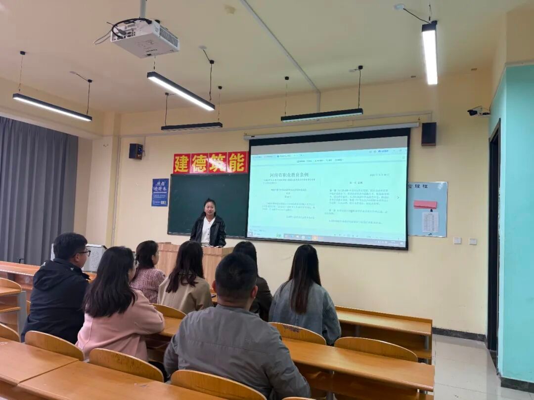 在各教研室宣贯会上,各教研室主任对2025年9月1日正式施行的《河南省职业教育条例》进行了全面解读,重点围绕条例的立法背景、重要意义和主要内容开展学习。会议指出,要深刻认识条例对推动职业教育高质量发展的指导作用,准确把握职业教育与普通教育具有同等重要地位的类型教育定位。